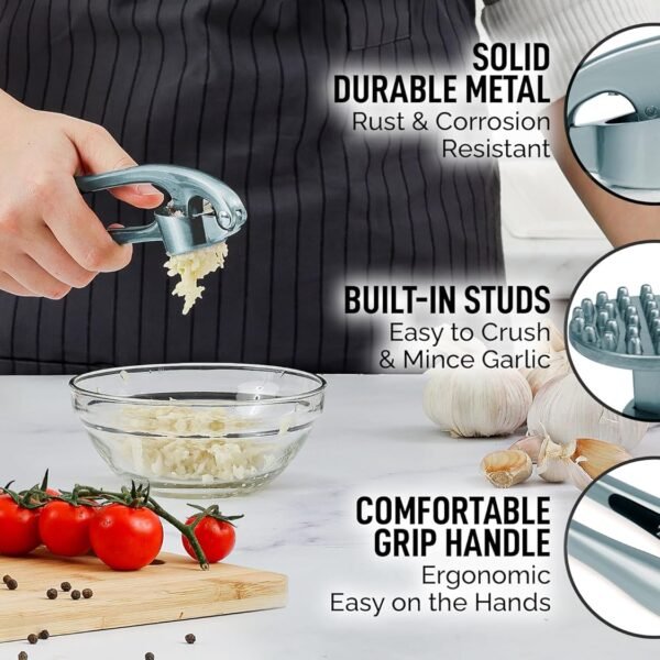 Premium Garlic Press Set – Rust Proof & Dishwasher Safe Professional Garlic Mincer Tool – Easy-Squeeze, Easy-Clean with Soft, Ergonomic Handle – Silicone Garlic Peeler & Brush (Silver)